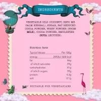 Ingrediente: Uleiuri vegetale(nuca de cocos, miez de palmier), zahar, pudra de cacao cu un continut scazut de grasimi, zer pudra(din lapte), pudra de cacao, emulgator(lecitina de soia)