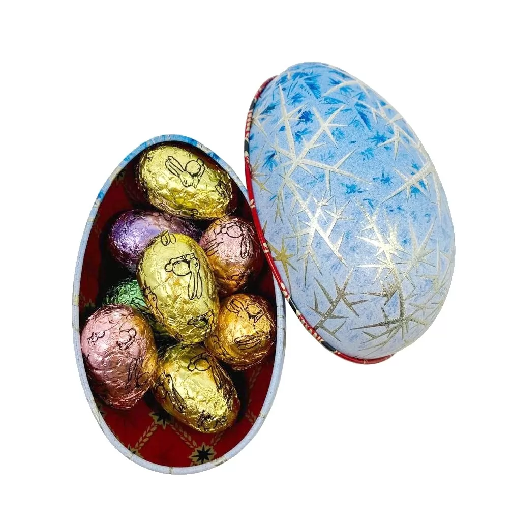Cutia metalica in forma de ou Faberge contine 8 oua de ciocolata belgiana Valentino, diverse sortimente, ambalate individual.