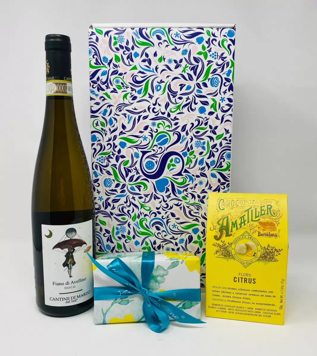 Pachet cadou cu vin alb Fiano Di Avellino praline Amatller si praline Valentino