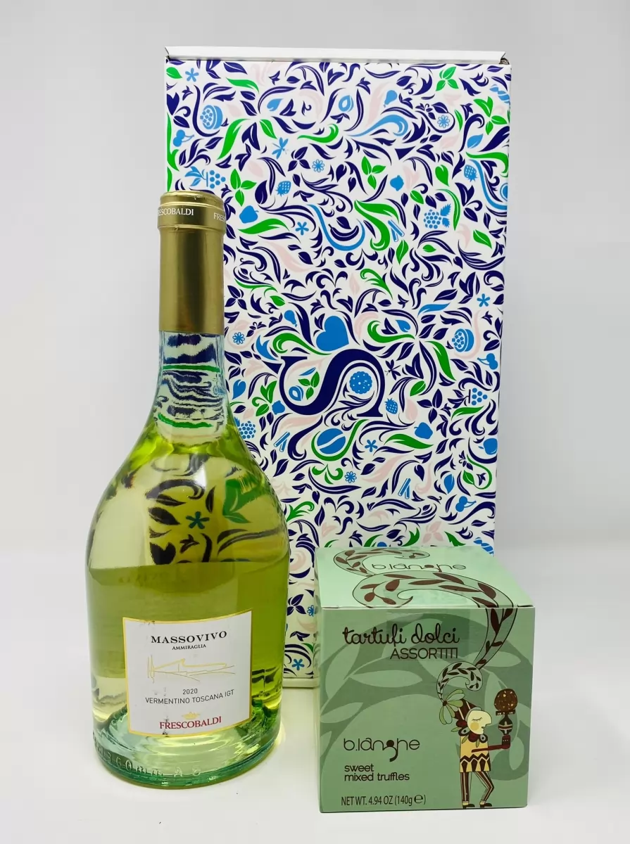 Pachet cadou cu vin alb si trufe de ciocolata