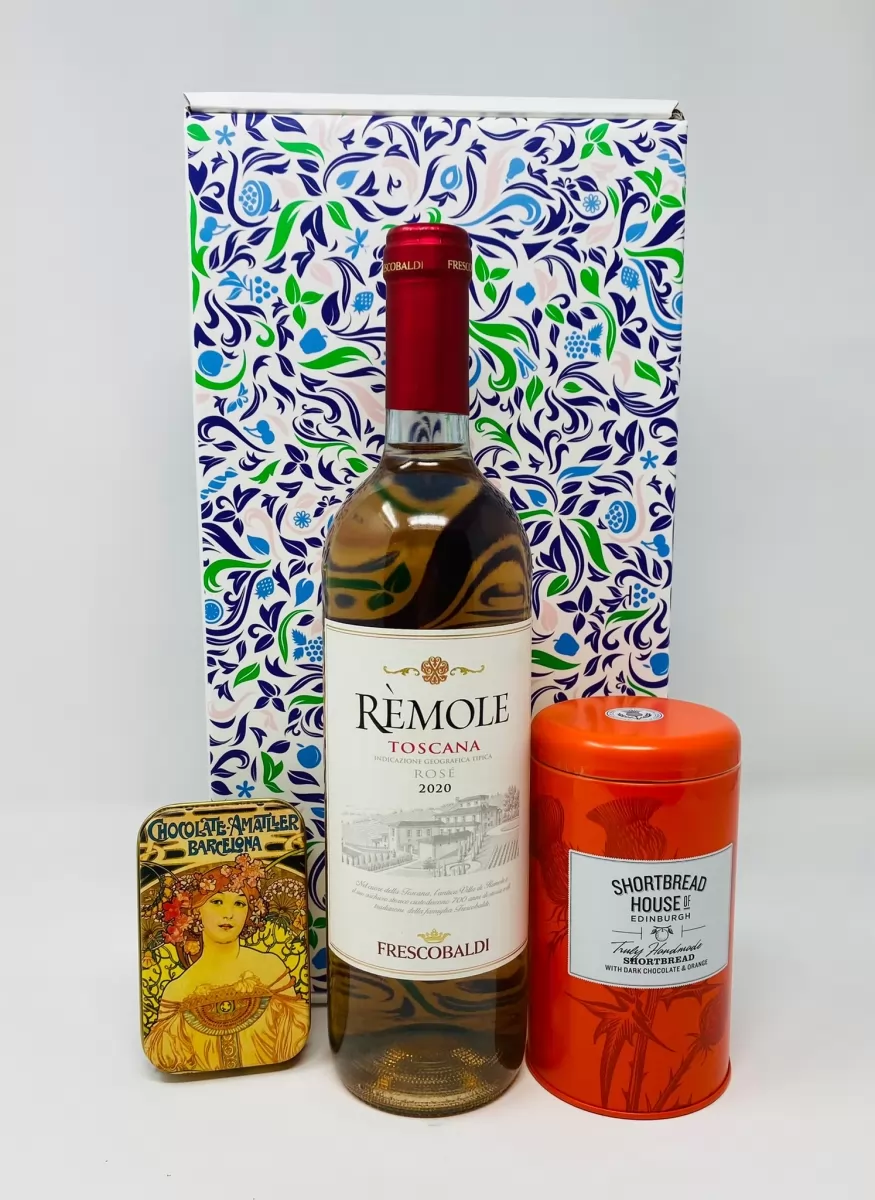 Pachet cadou cu vin rose, ciocolata si biscuiti artizanali