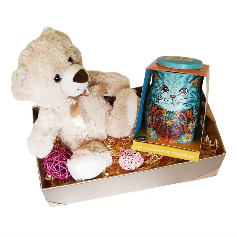 Pachet cadou pentru copii cu ursulet si cutie cu trufe de ciocolata Monty in forma de pisica