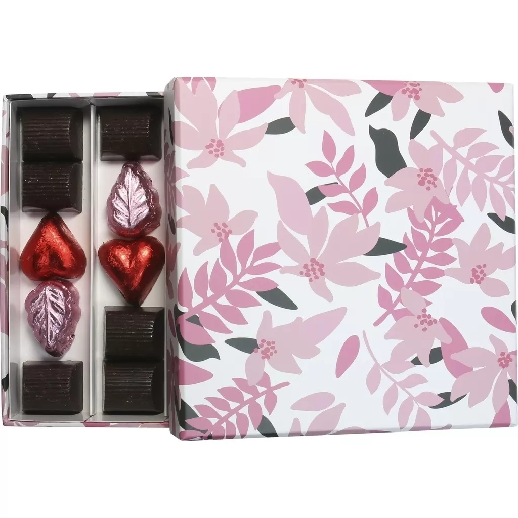 Cutie cu 20 de praline asortate din ciocolata belgiana Valentino. Pralinele din poza de prezenare pot varia, insa sunt din gama premium a producatorului belgian Velentino.