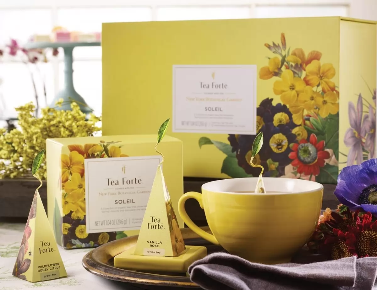 -o cutie cu 10 piramide de ceai Soleil Mini Petite, editie limitata: 2 piramide Darjeeling Quince( ceai negru), 2 piramide Cherry Blossom( ceai verde), 2 piramide Wildflower Honey Citrus( ceai verde), 2 piramide Vanilla rose( ceai alb) si 2 piramide Wildberry Hibiscus (pe baza de plante)