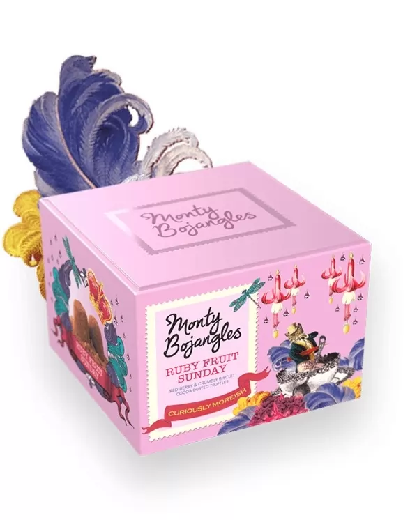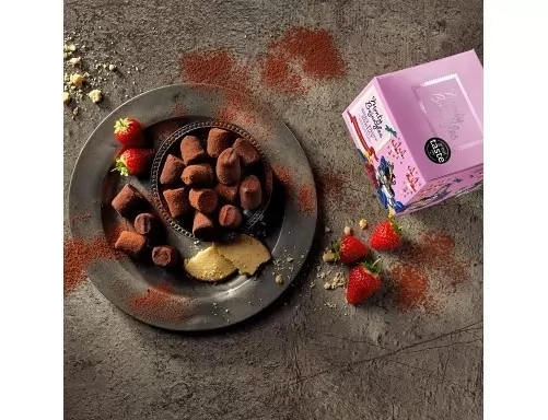 Trufe frantuzesti de ciocolata cu lapte si fructe rosii. Reteta traditionala dateaza inca din anul 1934, fiind conceputa pentru prima data in Angers, Franta. Cutia are un aspect pe care nu il poti uita usor, plin de viata datorita designului si poate fi daruita ca o mica atentie sau chiar pentru propriul rasfat.