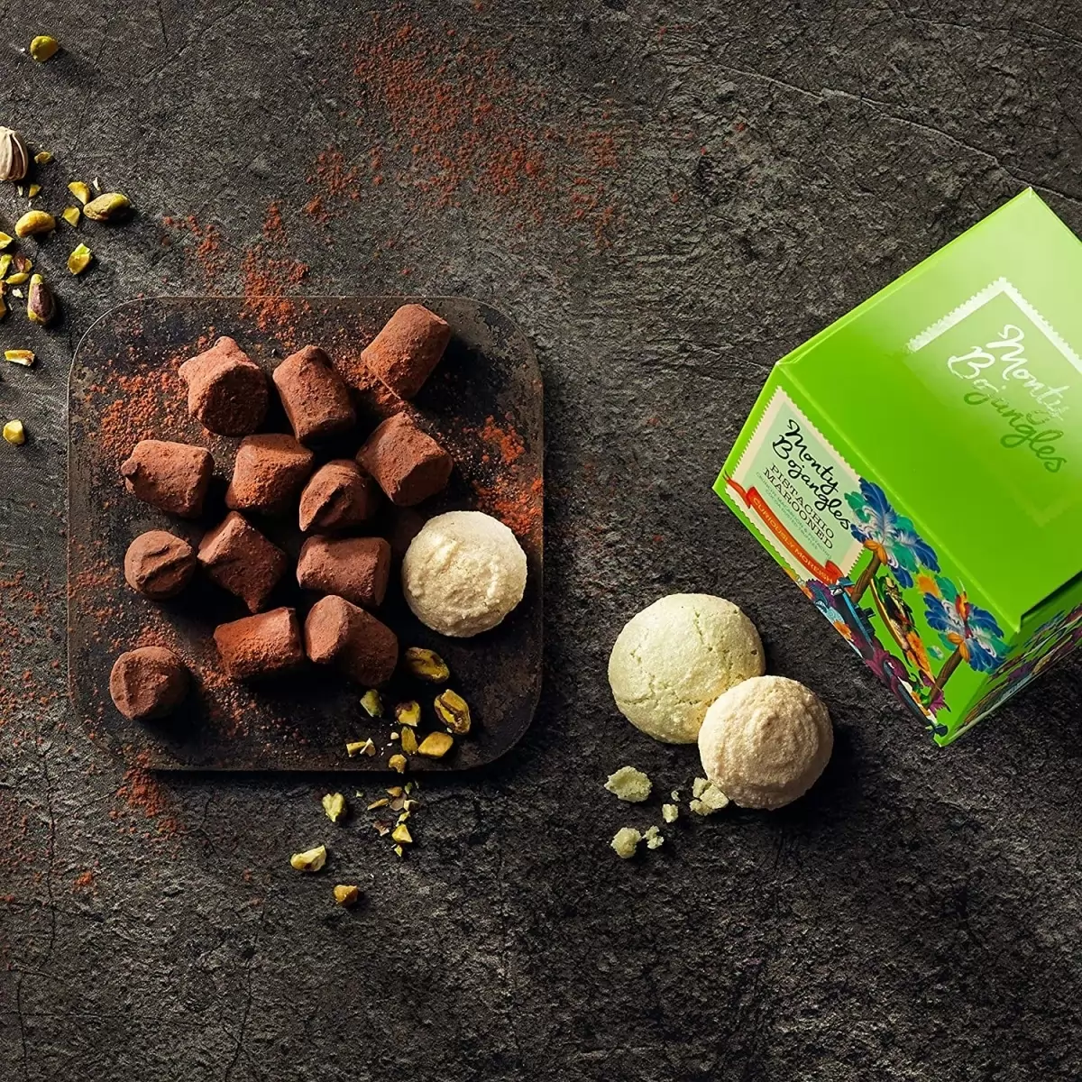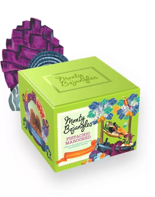 Trufe frantuzesti cu ciocolata neagra si fistic. Reteta traditionala dateaza inca din anul 1934, fiind conceputa pentru prima data in Angers, Franta. Cutia are un aspect pe care nu il poti uita usor, plin de viata datorita designului si poate fi daruita ca o mica atentie sau chiar pentru propriul rasfat.